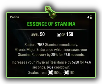 Another effect you can squeeze into potions with the Restore Stamina effect is Restore Health. However this causes the potions to be much more expensive to craft. On top of that, you have to use these potions on cooldown because you need the Stamina, which means you can't save the heal for when you actually need it, and the passive Health Recovery increase is basically meaningless because Health Recovery is a weak and redundant stat which barely does any healing. Because of that I recommend the cheaper potions as the default option, but if you don't mind the cost you can use the ones with Health Restore. You can craft them by combining Columbine, Mountain Flower and Beetle Scuttle.