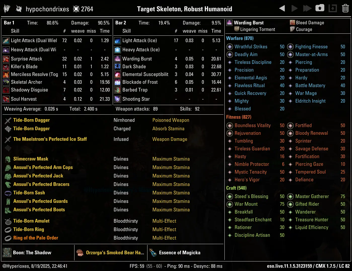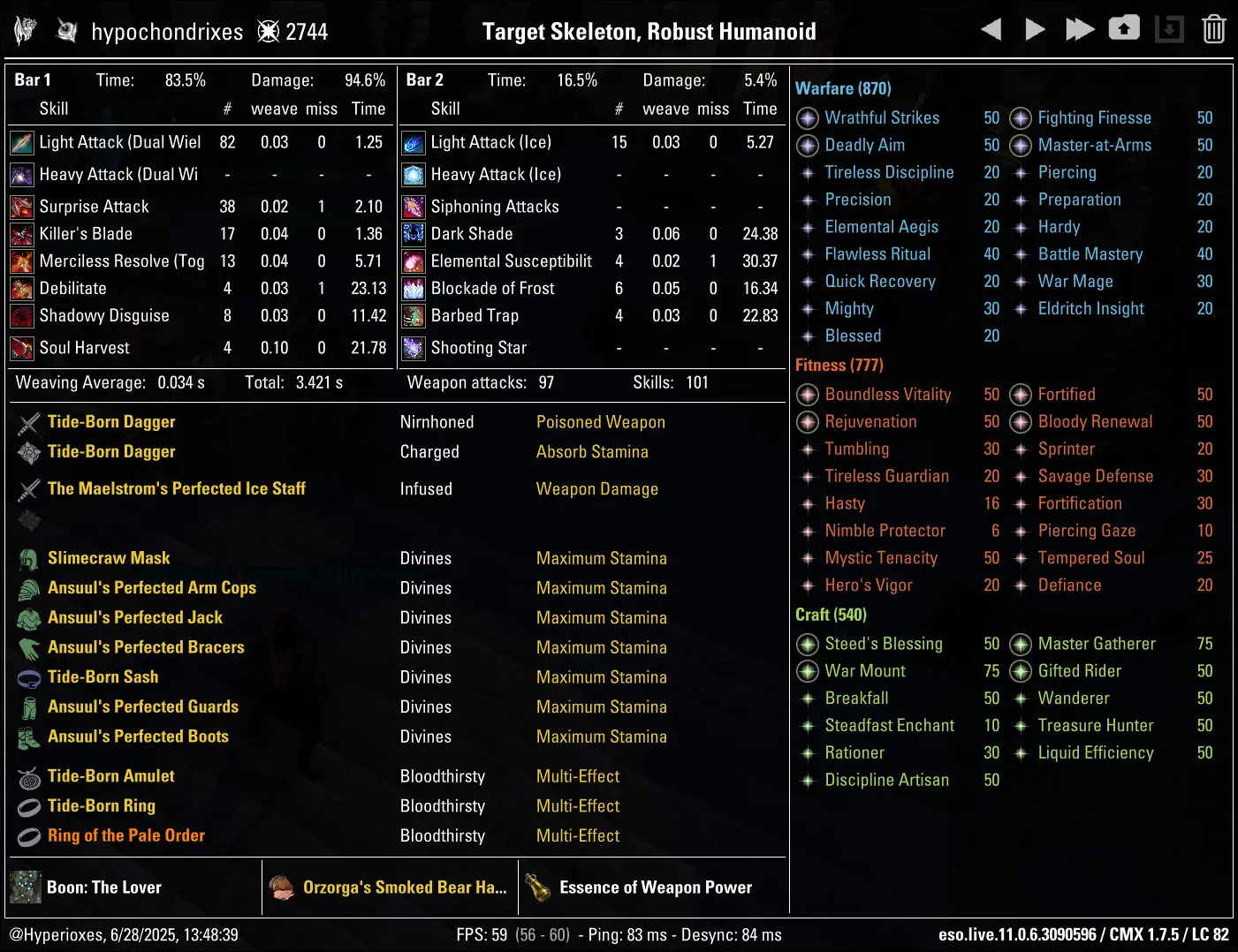 There is no "Full-Damage" gear setup, because giving up Pale Order was providing very minimal DPS increase (either by switching it to Velothi or a Monster Set like Selene), which was then being immediately lost by having to switch Wrathful Strikes to Reaving Blows, resulting in a setup with similar DPS but way worse survivability